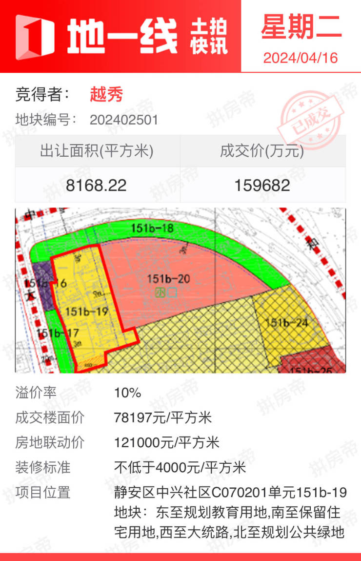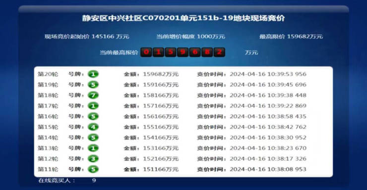 上午,静安区中兴社区C070201单元151b-19地块举行了现场交易会,上海土地市场官网对地块出让过程进行了直播。