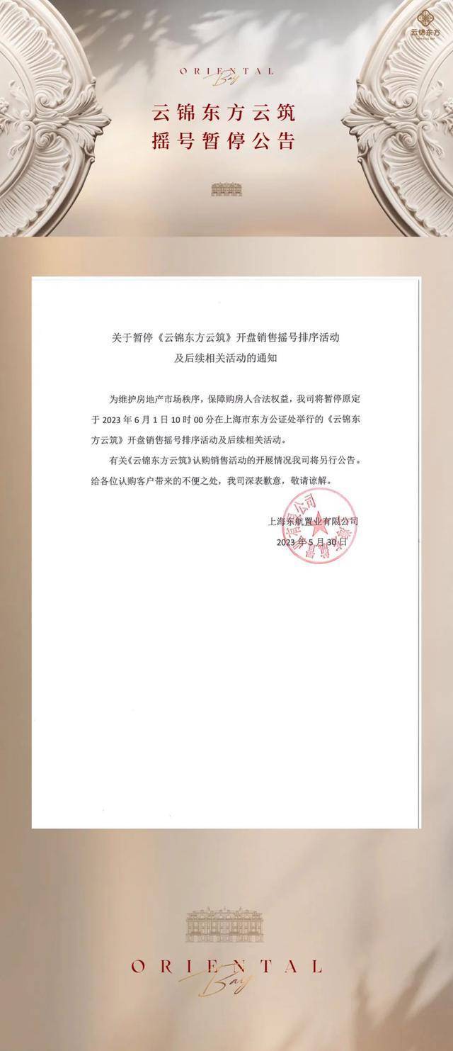 上海豪宅项目云锦东方。图片来源:中房报图库上海豪宅新盘云锦东方云筑宣布暂停摇号。5月30日13时56分,上海网红热盘云锦东方云筑发布摇号暂停公告,公告显示,为维护房地产市场秩序,保障购房人合法权益,上海东航置业有限公司将暂停原定于2023年6月1日10时00分在上海市东方公证处举行的《云锦东方云筑》开盘销售摇号排序活动及后续相关活动。有关《云锦东方云筑》认购销售活动的开展情况将另行公告。