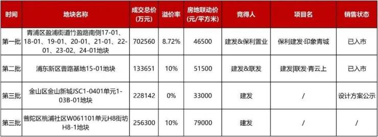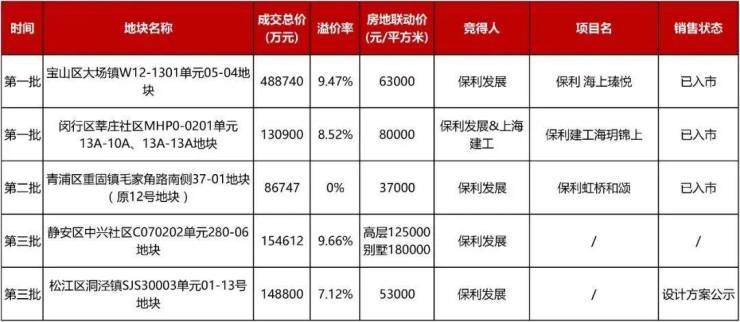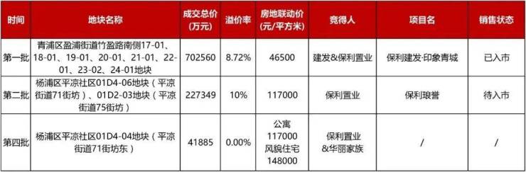 保利置业竞得的3个地块总金额97.1794亿元,位于青浦的保利建发·印象青城已入市,触顶竞得的杨浦平凉社区地块据悉案名定位保利琅誉,预计明年入市;同板块内的另一幅地块是联合华丽家族底价竞得的,风貌住宅联动价达到148000元/平方米。