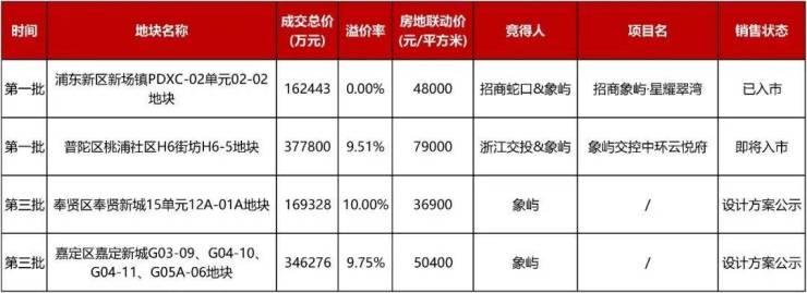 象屿竞得的4幅地块总金额105.5847亿元,联合招商蛇口竞得的招商象屿·星耀翠湾已入市,联合浙江交投竞得的象屿交控中环云悦府即将入市,单独夺得的奉贤新城地块和嘉定新城地块预计明年入市。