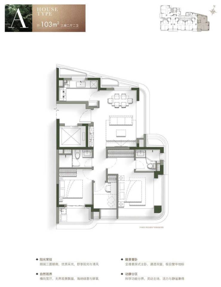 所以为了将项目的景观资源更大化利用,项目边套A户型做到了3面采光,让观景角度更广。