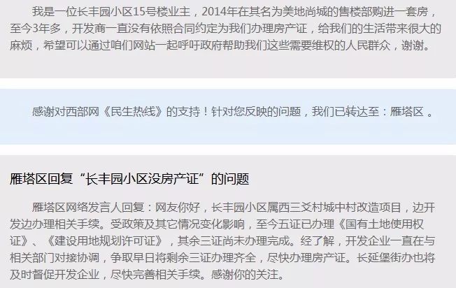 就在2月份维权活动的前两天,一位身居上海的业主致信西安市政府,表达了自己深深的优思:关于长丰园房产证问题的答复,从2011年到2018年,回答总是没变过,估计管事的人都变了好几拨了吧。政府一直说是督促,不知道是怎么督促的。