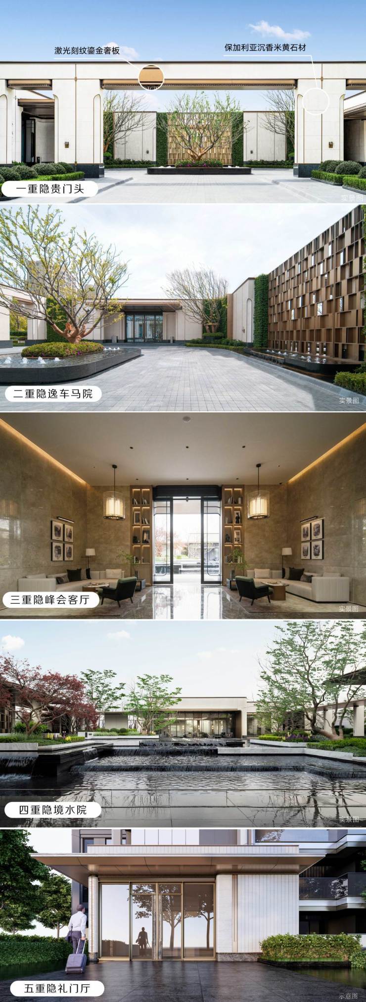 打造约80m【尊享礼仪轴】,串联五重归家礼序。一重高约6m、宽约50m隐贵门头,二重隐逸车马院,三重隐峰会客厅,四重约650㎡隐境水院,五重隐礼门厅。