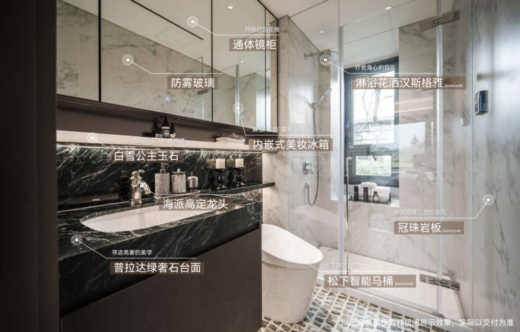 映江润府打造了5大高效扩容的收纳体系,实现了5大卫浴精工,从各种收纳场景的设计,到升级落地拉手的细节,真正是可以比拼千万级豪宅的配置, 西门子、汉斯格雅、科勒、方太、欧派……臻选一线大牌或同档品牌,首批次客户赠送双开门内嵌冰箱,建面约103㎡户型双卫生间均配置智能马桶,看遍上海也得说一句,是千万级顶豪的交付标准没错了!