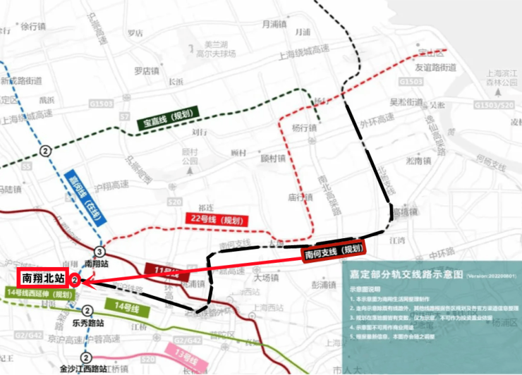 接对接现有轨交11号线南翔站,更是有可能往西南侧继续延伸对接铁路南翔北站,此前网上就有一张“嘉定部分轨交线路示意图”流出;上面清晰标示原22号线(现31号线)的走向有南翔北站;这张图上还有南何支线(规划)的南翔北站的走向。