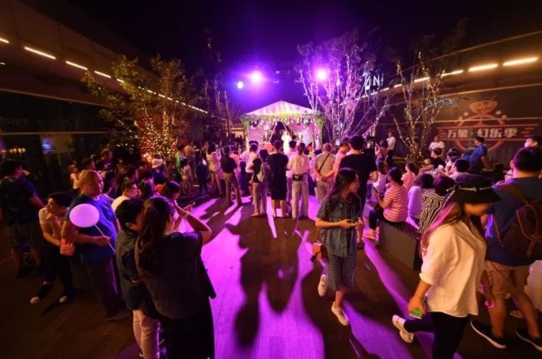 活动在商场六层的室外露台,邀请到了乐队、DJ前来演出,现场还有场内租户RIBONE STEAKHOUSE的牛排与蓝蛙的冷焰火表演。