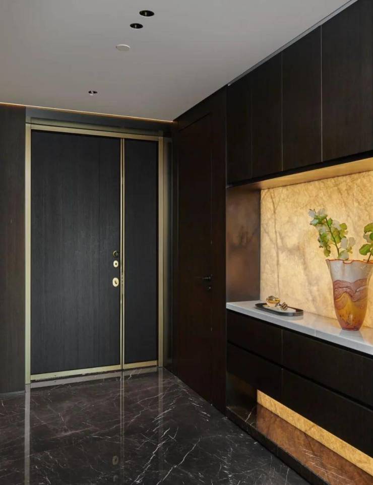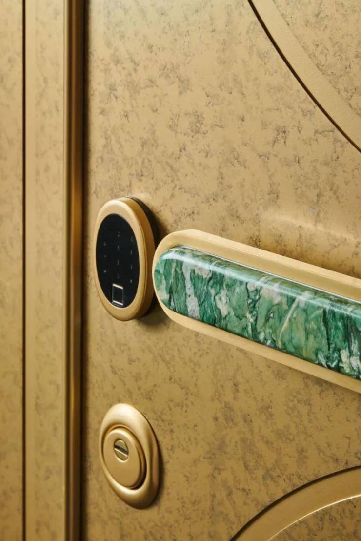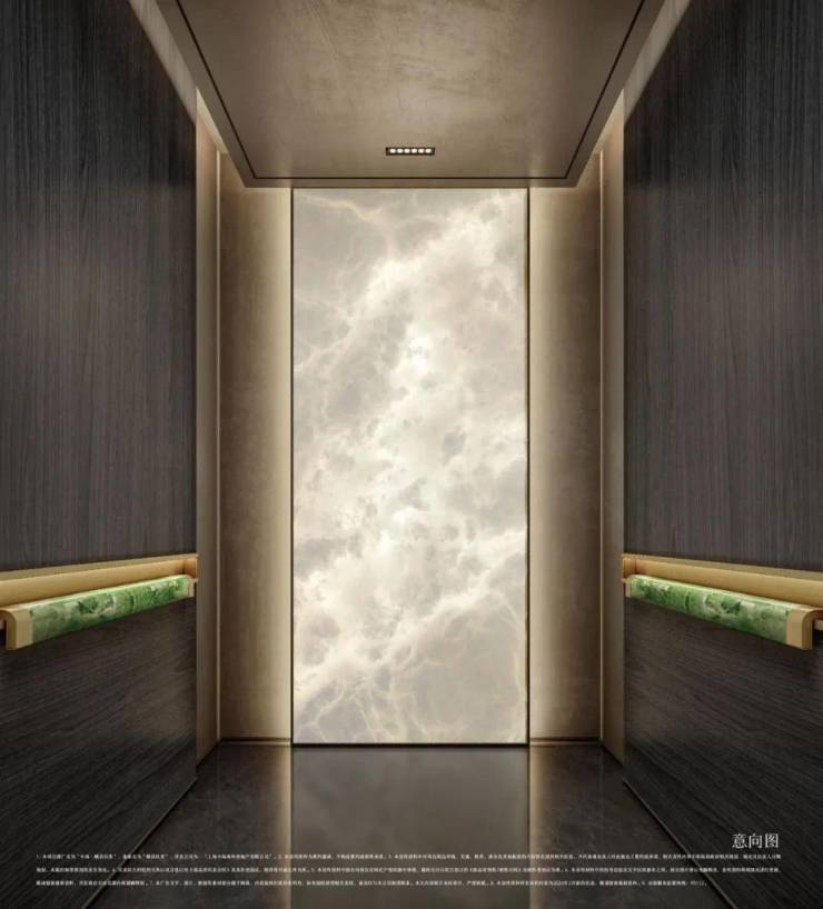 车库入口延续一路的商业街风貌,做成了精致的橱窗样式。地下入户电梯间的提示灯、轿厢内部扶手,都采用天然翡翠绿大理石。