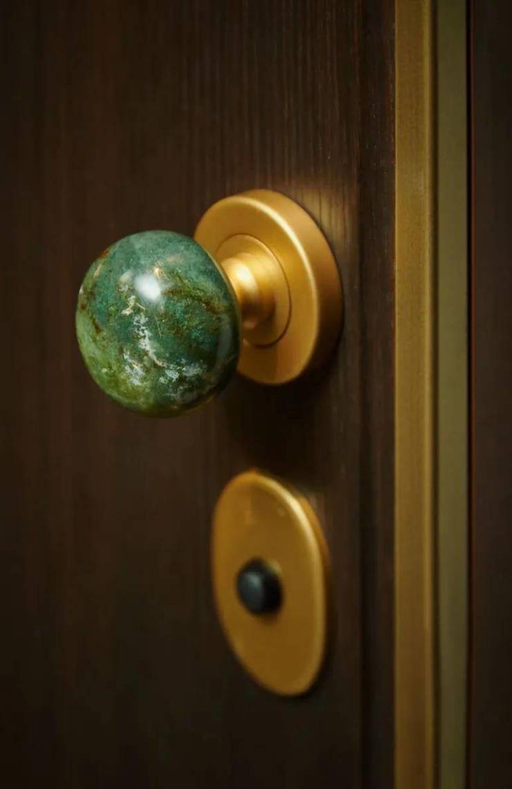来到接待台,采用手敲铜工艺制作,台子主体上,镶嵌着与门把手同款的翡翠绿大理石,所有石材皆系天然。