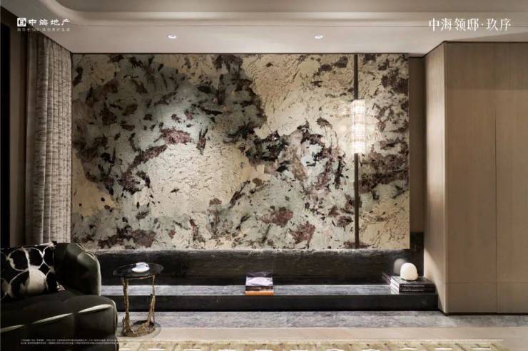 门把手内外都镶嵌着蓝绿色玉石、玄关处光彩夺目的雪山蓝湖奢石、圆弧悬浮吊顶、实木复合的鱼骨拼花地板、整块雪山蓝湖的石材作为背景墙、餐边柜使用整块厚约2CM的天然玉石等等,数不清的细节、亮点、工艺暗藏着中海对高端生活的理解与追求。