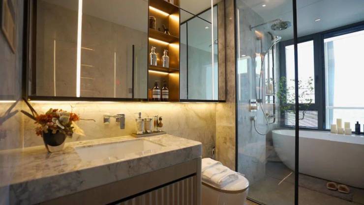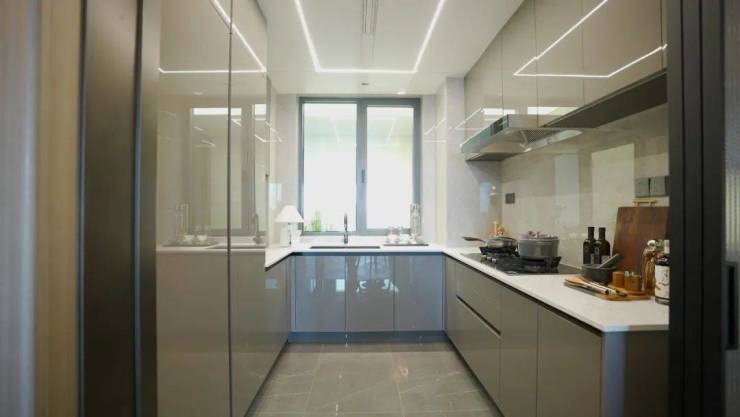 博世的触摸屏系列的油烟机及灶具,美诺或嘉格纳同等品牌的洗碗机、内嵌冰箱,西厨配置蒸烤一体机等,唯宝的台盆、当代的龙头、恩仕的马桶、汉斯格雅的花洒,线性浴霸、美妆冰箱,以及一个可以连接蓝牙的智能化温泉浴缸,从生活的方方面面提升业主的居住舒适度!
