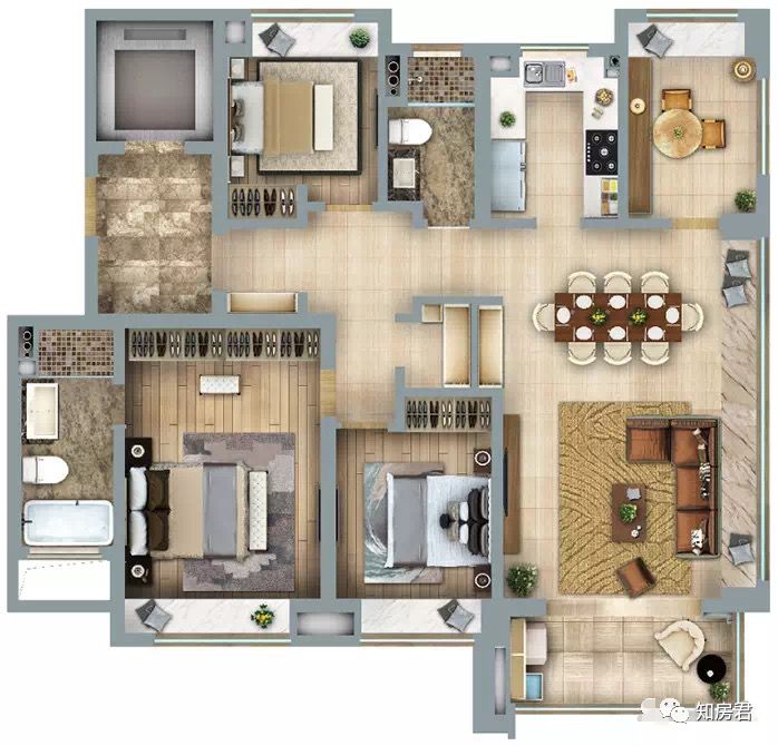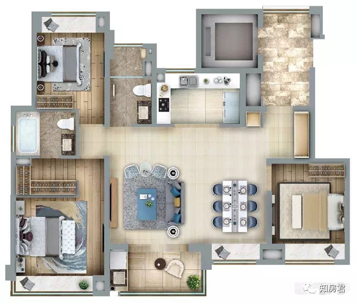 但户型设计比较合理,很是方正,全南朝向,南北通透。不管是三房还是四房都做到了餐客厅一体化,看上去空间极大。