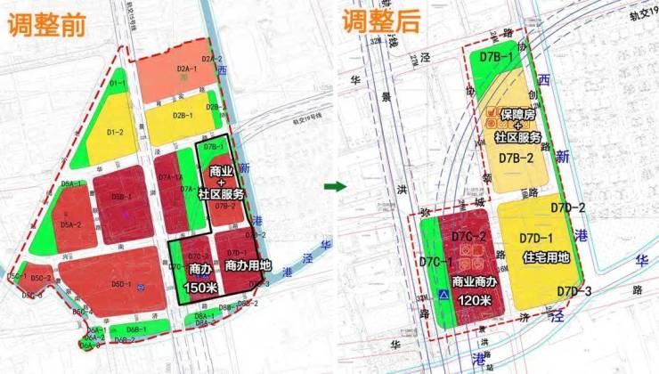 该地块原为商办C8性质用地,高度150米,调整后为商办商业混合用地(C2C8,C2>60%、C8≤40%),建筑高度降低至120米。
