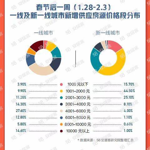 月租金价格段方面,春节后一周(1.28-2.3)一线城市租房供应中4001-6000元的房源占比27.6%,2001-4000元的房源占比25.5%;新一线城市中,1001-2000元的房源占比最多,为44.5%,2001-3000元的房源占比25.1%。