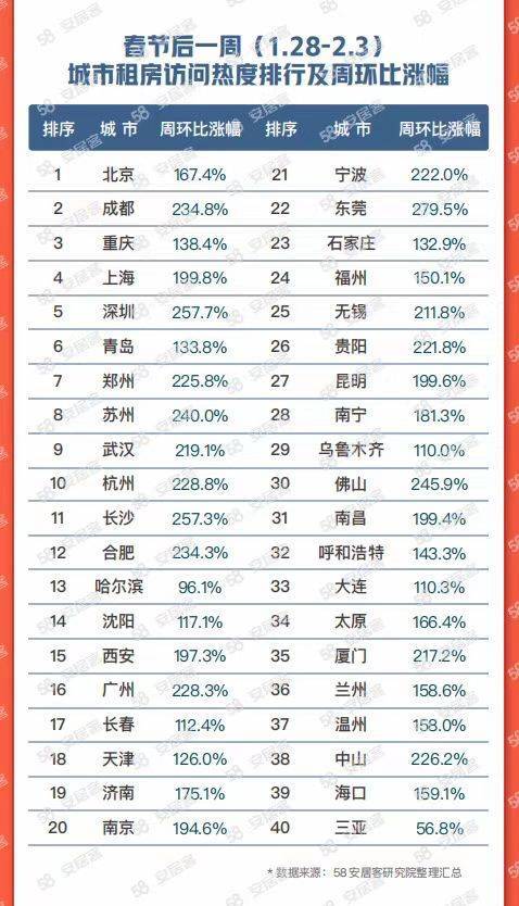 2月9日,58同城、安居客发布《2023节后返城租房调查报告》,报告显示,伴随节后返乡大军回流以及新一年的跳槽热,租赁市场也迎来旺季,重点城市春节后一周租房热度环比翻倍,部分城市租房热度涨幅超过200%。