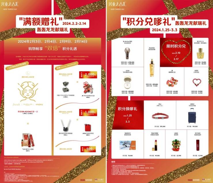 礼遇派送不止如此,兴业太古汇 “轰轰龙龙献瑞礼”新春促销携丰厚新年福利为假日消费加码。现金礼券、满额赠礼、积分翻倍等一系列促销活动不间断上演,消费者最高可享价值约3000元的礼品,为新春假期加满活力。