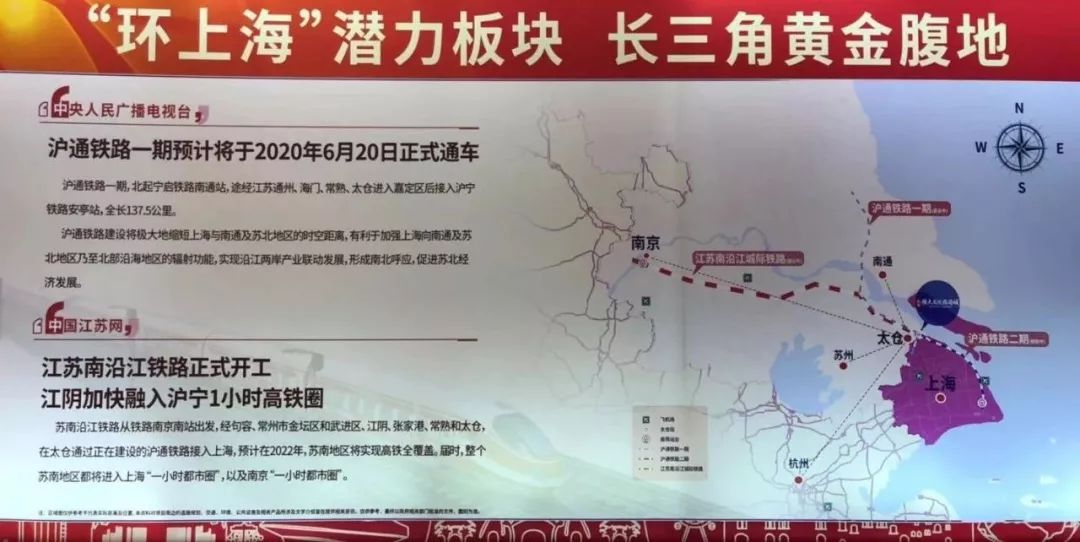 目前,沪通铁路一期(西线)已全面开工,太仓境内的铁路高架桥和3座车站已初现端倪。2020年6月20日,太仓可通过沪通西线,先接入上海站(静安区)、上海虹桥站,取得和昆山一样的区位优势;待到2021年,沪通铁路二期(东线)开通后,太仓更可直达上海北(宝山杨行)和上海东站(浦东机场旁);届时,环沪诸城中唯太仓有直达上海东(浦东)、西(虹桥)、北(宝山)、中(静安)4个方向的列车,相比昆山、嘉善,后来居上的太仓到上海各区的通达性会更高!