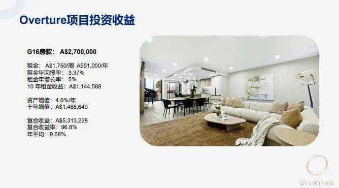 澳洲房产每年稳定的租金回报在5%-7%,平均每年房产增值10%,每7年为一个周期翻一番。这种稳健的租金回报和增值潜力是吸引投资的重要因素。