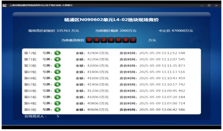 5月9日,上海今年第四批次土地集中出让正式开拍,杨浦东外滩地块率先出让,上海土地市场官网进行全程直播。