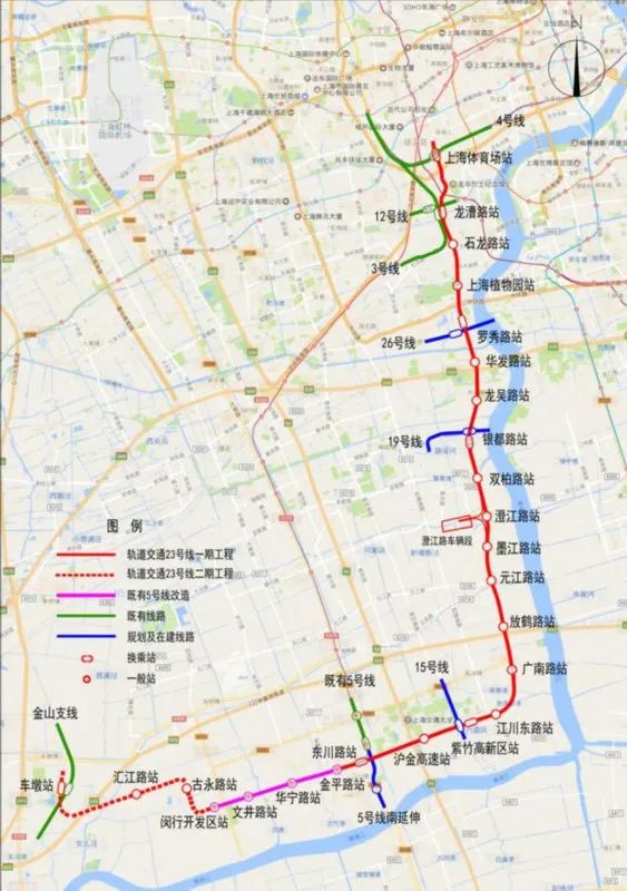 根据规划,23号线一期紧贴闵行滨江一路向北,将闵行开发区、紫竹高新区、吴泾、徐汇滨江等重要区域一线串联,打通了上海南部区域的交通命脉。