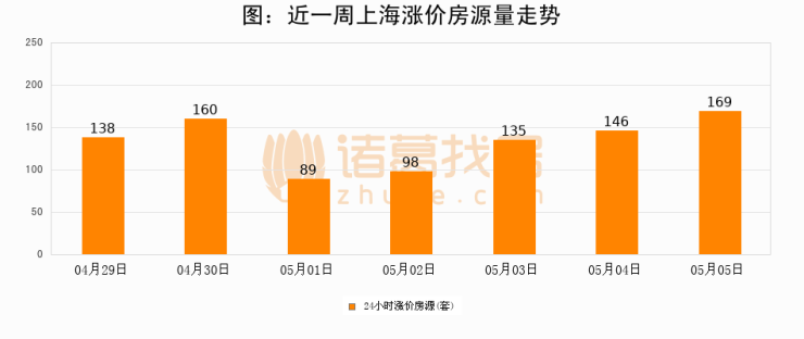 根据诸葛找房数据显示,上海24小时涨价房源量为169套,较05月04日增加23套,环比上涨15.8%。与此同时,涨价房源占比小幅扩大,业主信心有所提升。