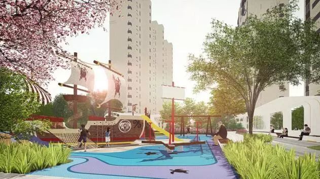 看一个开发商用心与否,可以看看儿童活动空间。龙湖天璞的儿童空间并不仅仅只是简单的器械,更是形成了充满童趣的主题——800平方米的场地,设计师以“海盗船停靠在沙滩上”的构图场景,打造出小小航海家的主题乐园,围绕沙岛、海浪抽化出地垫图案,又设置了攀爬墙,滑梯等,简直就是把游乐场搬进小区里!