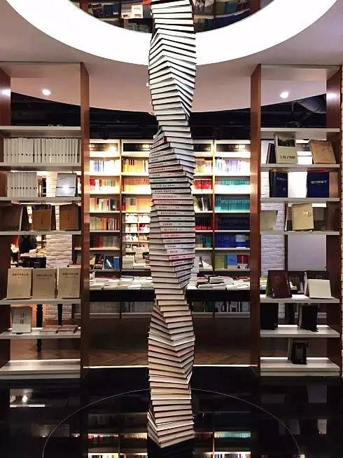 店中有一处将书本螺旋叠起的“书梯”,也许是想表达出用书撑起心灵世界之意,也许是书山有路勤为径。年老的读书人和年轻的学者在这来来往往,细心翻阅,寻觅一本心仪的图书。