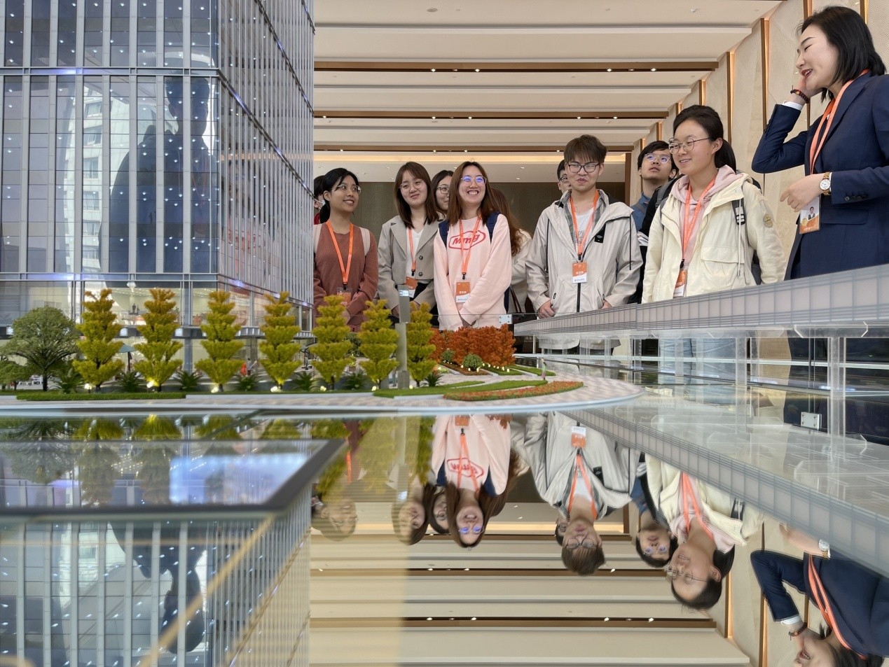 同学们在活动主办方的陪同下,分别参观体验了上海佳兆业金融中心设计优美的内外部环境、楼内的建筑沙盘、匠心独具的空中花园、企业办公区、典雅舒适的企业食堂,还有在其他办公楼里罕见的楼内共享健身房,这些以人为本、绿色环保,甚至带有健康养生理念、先进时代的办公建筑设计,给同学们带来全新又生动的视界和思维。