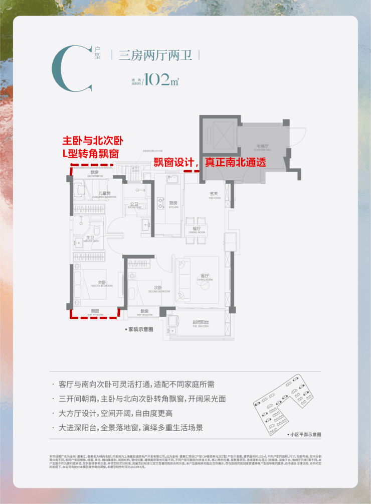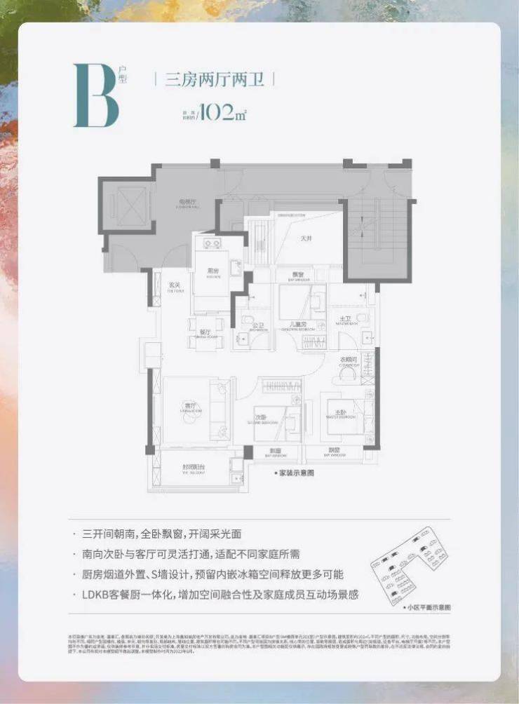 建面约102㎡品质大三房,功能性上实现了3房2卫,适配市场主流需求,主卧套房设计私密性舒适度兼具;格局上做到了三开间朝南,开阔采光面带来充足日照,让业主起居之间沐浴更多阳光;