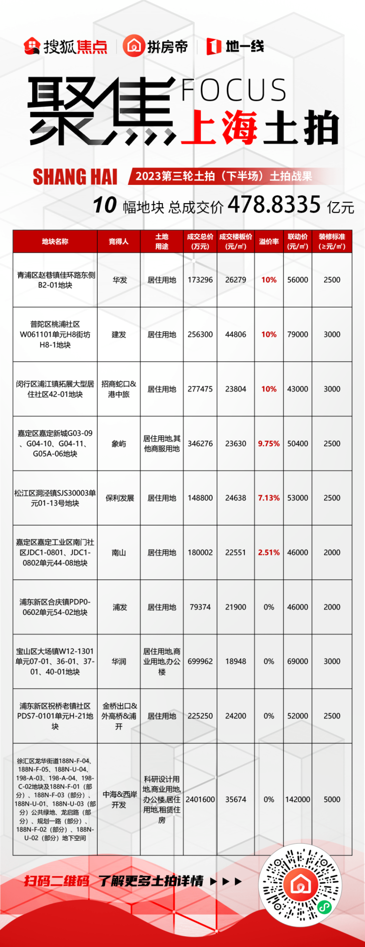 10月24日-25日,上海第三轮土拍(下半场)10幅地块完成出让,总出让面积57.51万方,累计成交金额约478.8335亿元。
