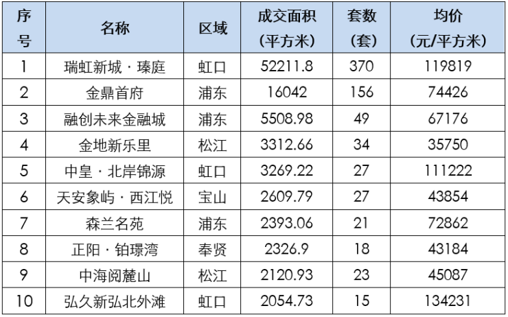 从交易结构来看,近期高价房占主角的格局未变。从成交前十榜单中可以看到仍有3个10万+产品上榜,并且排名排名前列的就是高价房产品。四川北路板块的瑞虹新城瑧庭,成交面积超过5万平方米,网签均价直逼12万元/平方米。从成交前十榜单能看出,最近刚需以及首次改善始终无法带动市场走强,“3字头”“4字头”上榜的项目签约都不超过40套。因此市场真正要回到正轨还需要时间来印证。