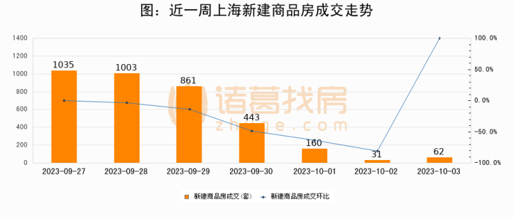 根据上海市房地产交易中心数据显示,2023年10月03日上海新建商品房成交62套,较昨日增加31套,环比上涨100%