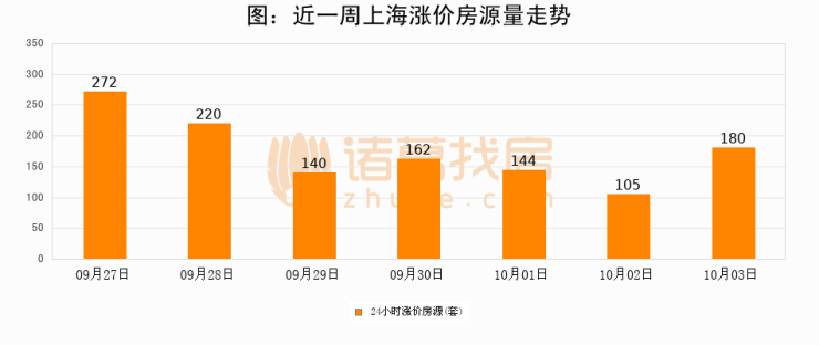根据诸葛找房数据显示,上海24小时涨价房源量为180套,较10月02日增加75套,环比上涨71.4%。与此同时,涨价房源占比小幅扩大,业主信心有所提升。