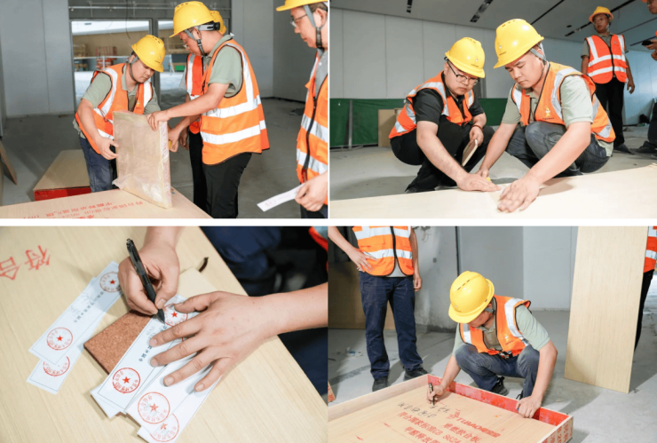 精准选样:公证检测小组深入项目核心区域,依据严格抽样规范,现场选取板材样本,确保检验结果能真实、全面地反映项目整体用料质量。
