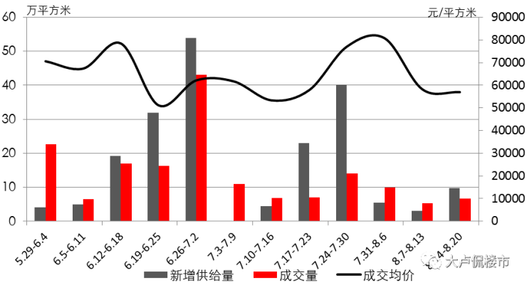 目前交易量萎缩,交易结构相对稳定,因此均价一直在低位波动,上周均价为56952元/平方米,环比下跌2.21%。