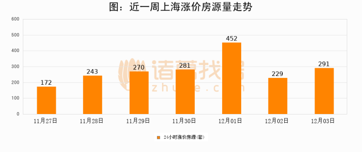 根据诸葛找房数据显示,上海24小时涨价房源量为291套,较12月02日增加62套,环比上涨27.1%。与此同时,涨价房源占比小幅扩大,业主信心有所提升。