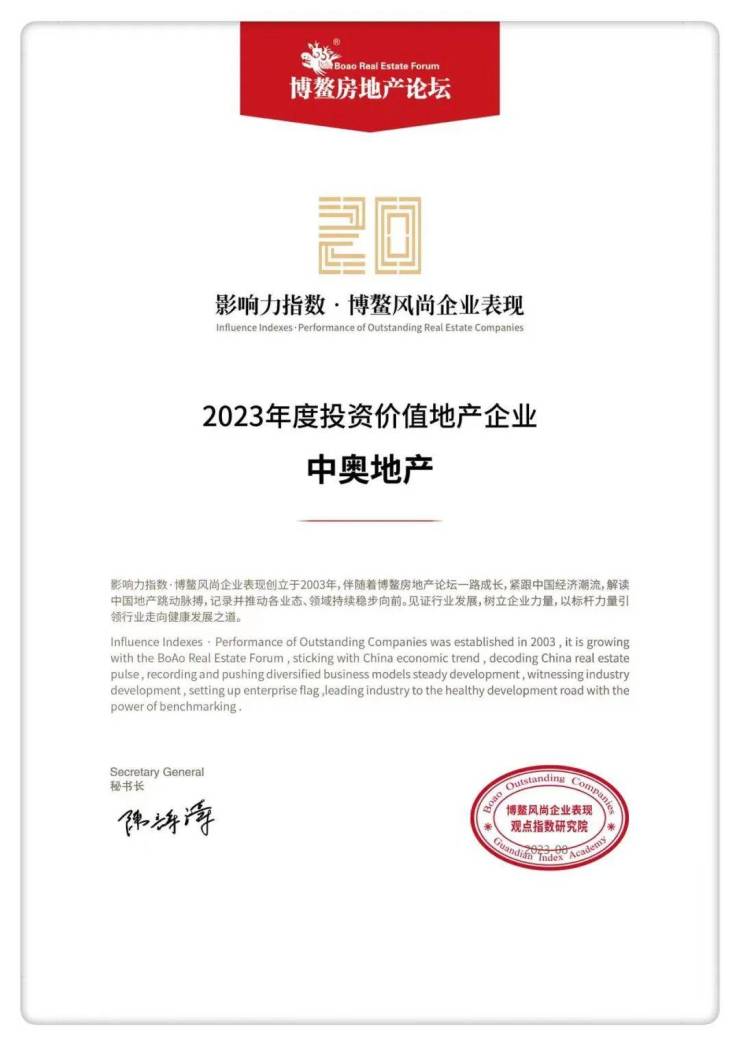 中奥资讯丨中奥地产获“2023年度投资价值地产企业20强”