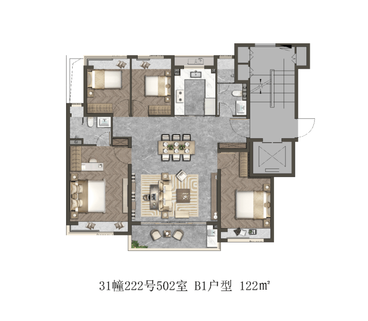 四房两厅两卫的布局,能做到两个房间朝南,主卧和南次卧的空间都很宽敞。