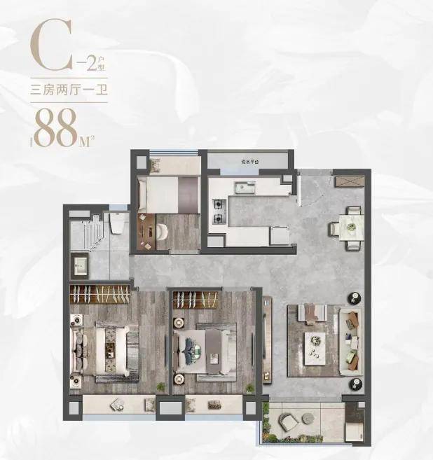 约88㎡三房两厅一卫,低总价小3房设计,三开间朝南,所有功能能够一步到位。