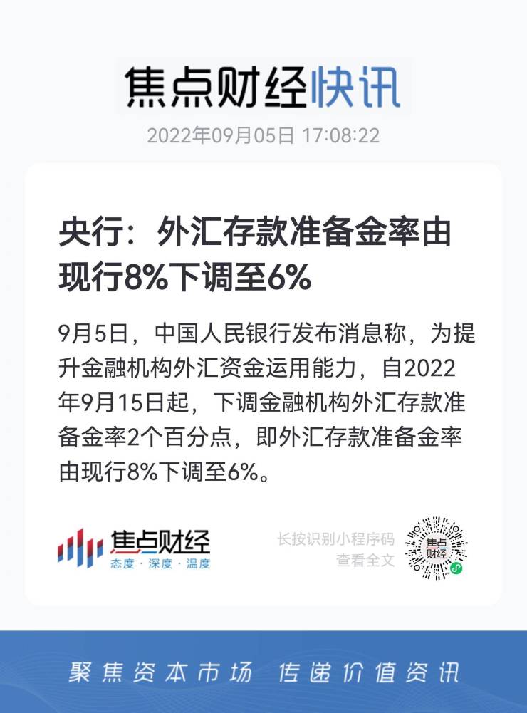 据中国人民银行官网消息,为提升金融机构外汇资金运用能力,中国人民银行决定,自2022年9月15日起,下调金融机构外汇存款准备金率2个百分点,即外汇存款准备金率由现行8%下调至6%。
