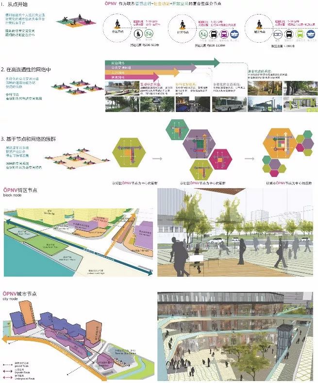 通过不同的个人交通出行习惯,分别根据不同的抵达范围,设置作为联系出行与社会功能和开放空间的复合型媒介节点,从街区级、社区级、城区级等不同层面提供精致的邻里交流空间和匹配的功能业态分布。在本次附加图则编制范围内,主要涉