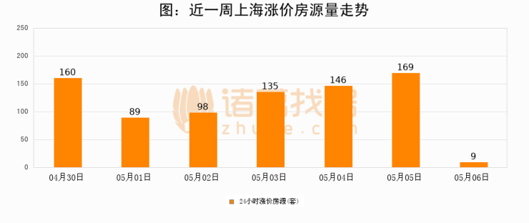 根据诸葛找房数据显示,上海24小时涨价房源量为9套,较05月05日减少160套,环比下降94.7%。与此同时,涨价房源占比小幅回落,对于购房者来说是一个入市窗口期,购房者可抓住时机入市。