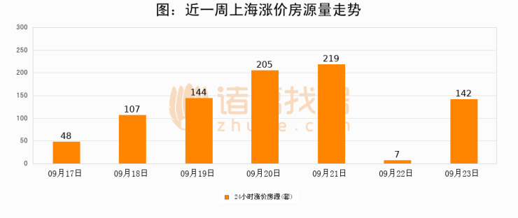 根据诸葛找房数据显示,上海24小时涨价房源量为142套,较09月22日增加135套,环比上涨1928.6%。与此同时,涨价房源占比小幅扩大,业主信心有所提升。