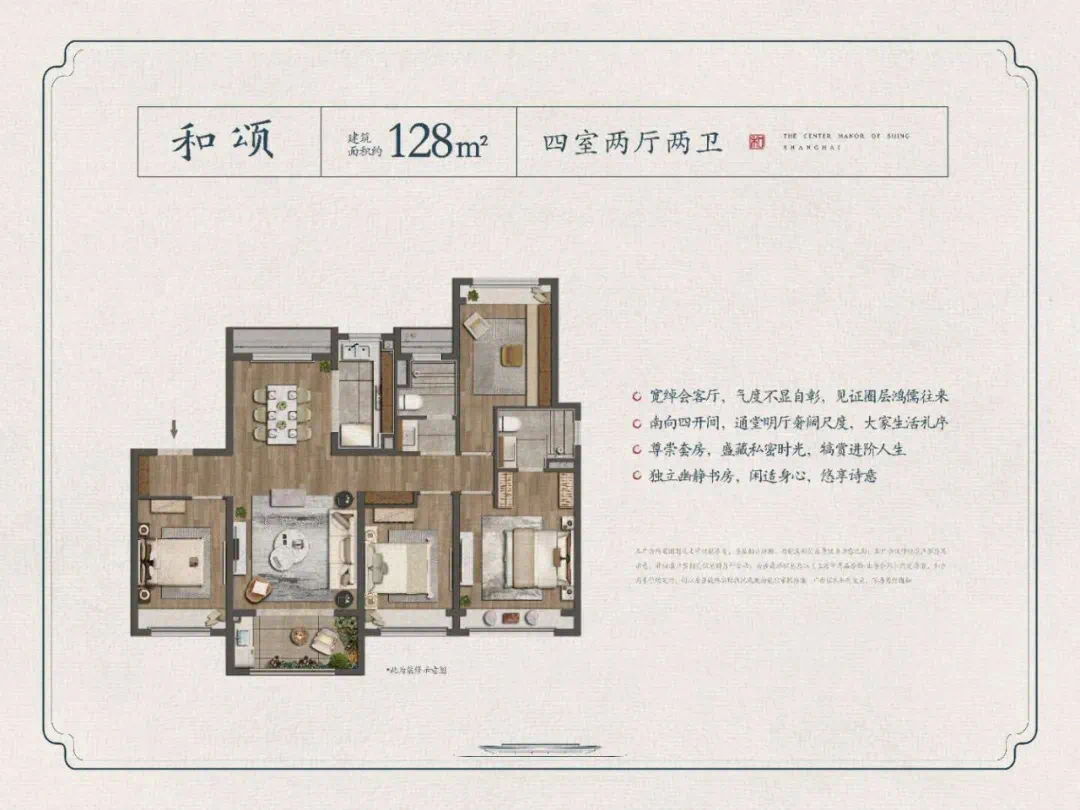 128㎡户型为南向四开间设计,南北透通,开阔明亮;入户玄关设计,出入方便;主卧套房设计,有独立的卫生间和衣帽间,私密性佳;卫生间干湿分离,避免了安全隐患,也保证了住户的私密性。该户型设计合理,实用性非常强,三代同堂或二胎家庭都非常适合。