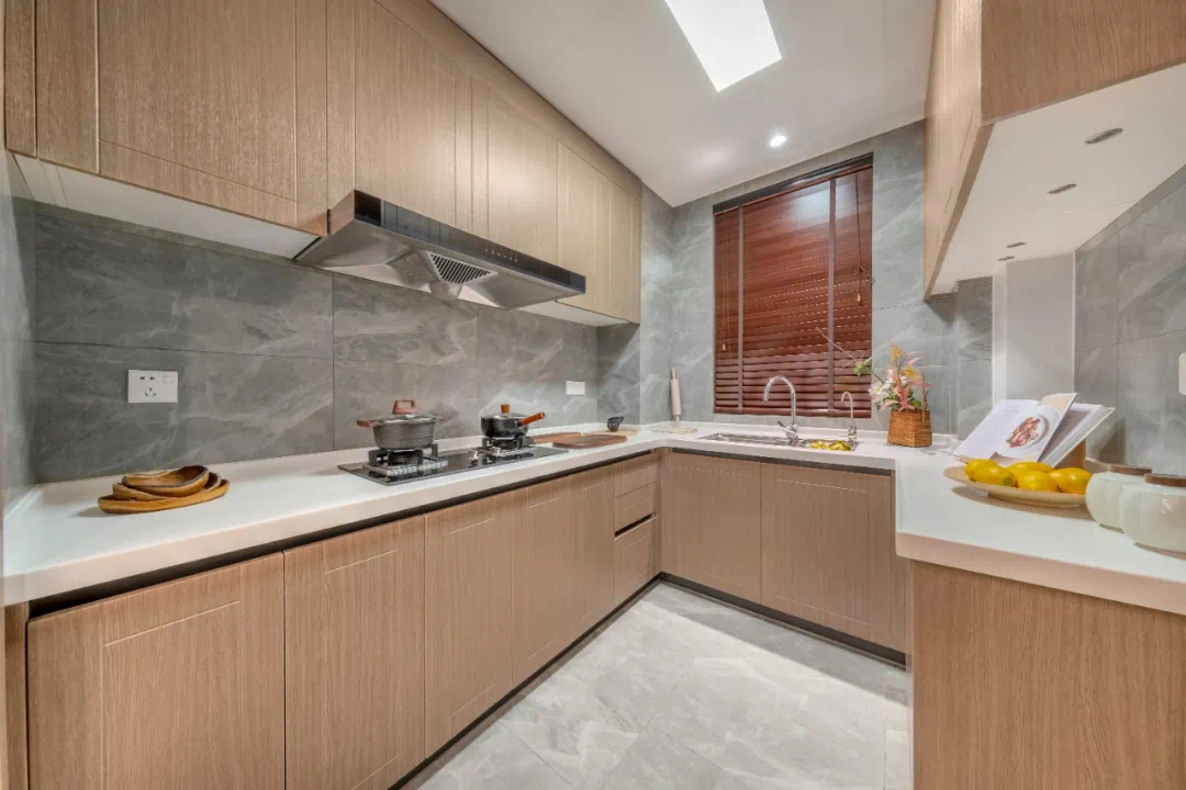 98㎡户型同样也是三开间朝南设计,加上南向的阔景阳台,室内采光和通风效果俱佳;主卧套房设计,有独立的卫生间,保证了住户的私密空间;U型厨房紧邻餐厅,方便操作。