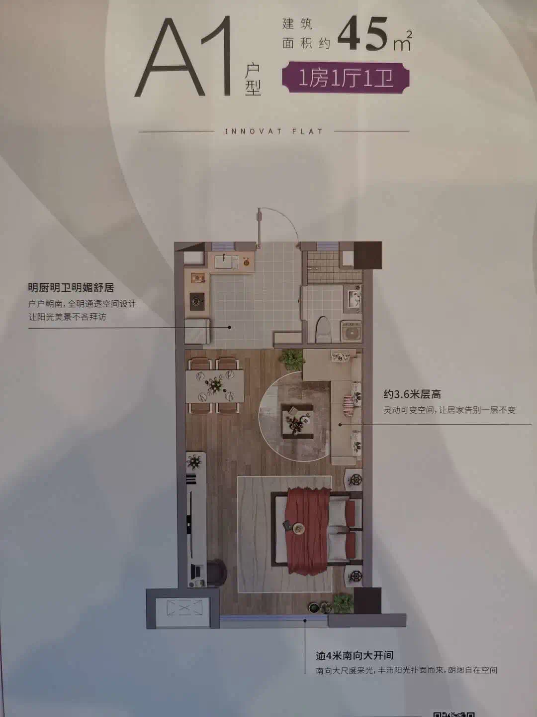 进门先是厨房、卫生间,中间为客餐厅区域,再往里为开放式卧室,开间约4米,层高约3.6米,可在允许范围内根据需要灵活改造。