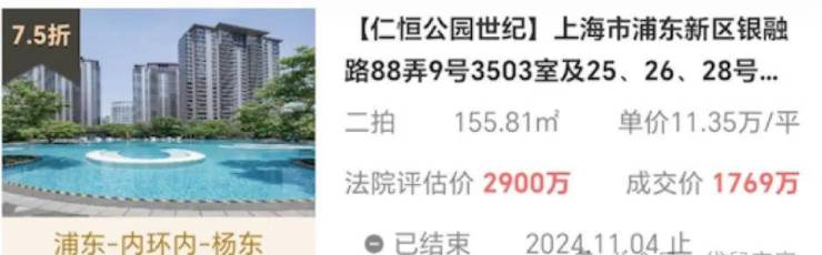 例如,浦东新区的仁恒公园世纪。建面约155.81㎡房源,总价约1769万成交。