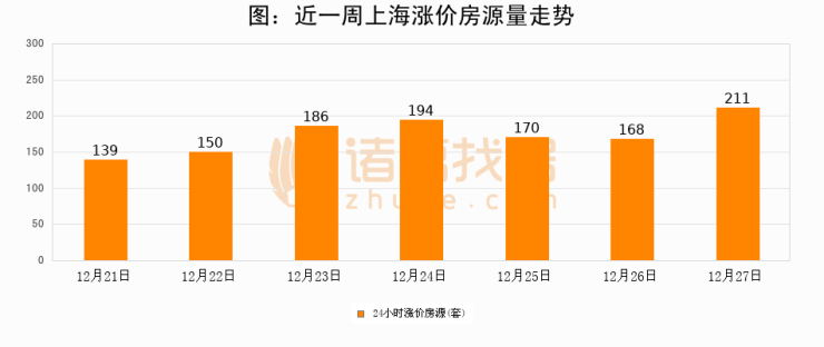 根据诸葛找房数据显示,上海24小时涨价房源量为211套,较12月26日增加43套,环比上涨25.6%。与此同时,涨价房源占比小幅扩大,业主信心有所提升。