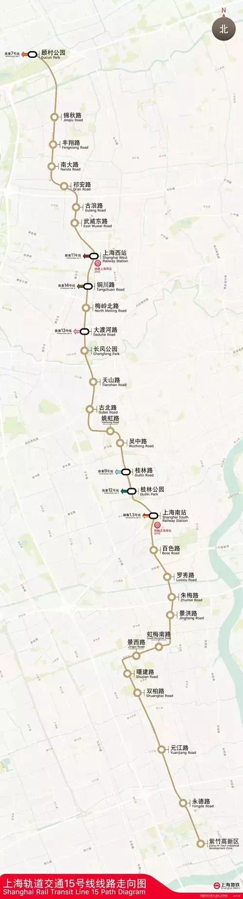 15号线北起宝山顾村公园,南至闵行紫竹高新区,沿线途经宝山、普陀、长宁、徐汇、闵行5个区。