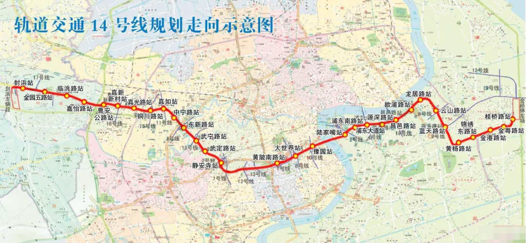 14号线西起嘉定封浜,东至浦东金桥,贯通嘉定、普陀、静安、黄浦、浦东5个区。