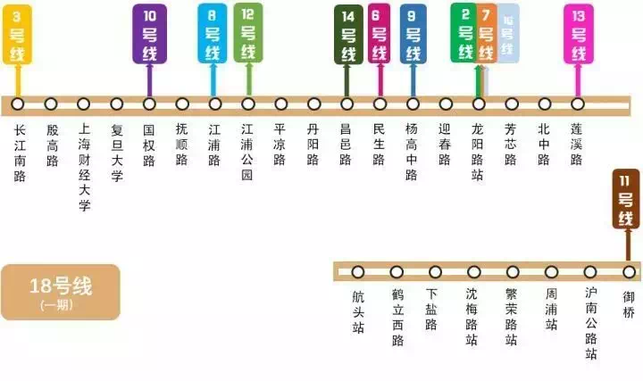 上海轨道交通18号线一期始于宝山区长江南路站,终于浦东新区的航头镇,沿线经过宝山、杨浦、浦东3个区的居住密集区。